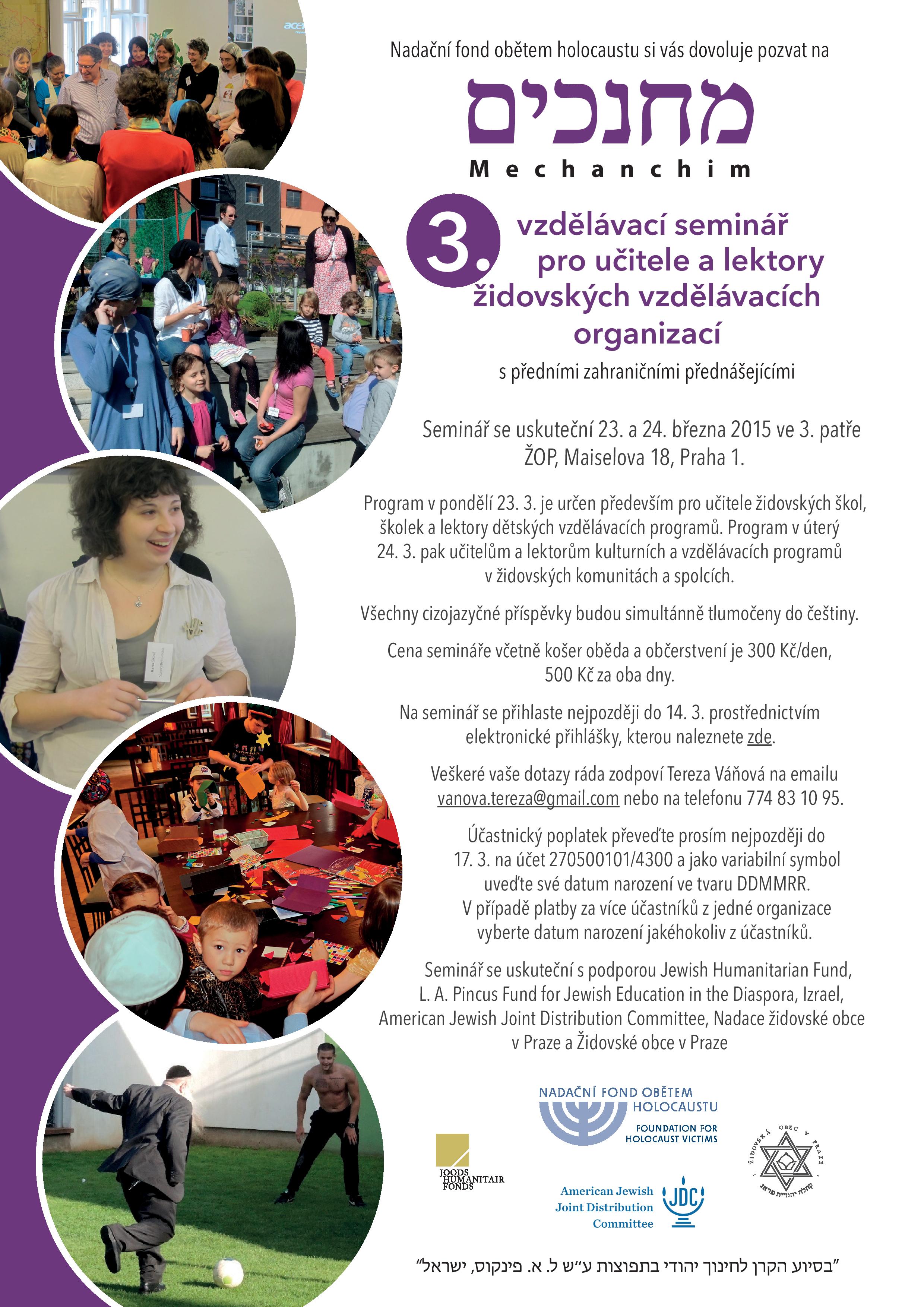 Srdečně zveme všechny učitele a lektory českých židovských vzdělávacích organizací na 3. ročník našeho tradičního semináře Mechanchim, který se bude konat 23. a 24.3.na židovské obci v Praze. Veškeré podrobnosti a program naleznete v přiloženém souboru. Na seminář se prosím přihlašte nejpozději 14.3. prostřednictvím elektronické přihlášky, kterou naleznete v tomto odkaze: https://docs.google.com/forms/d/1g2aPjCQakD3NUEbZ1yKh8fvIfOOIHsrSJWgHgY_sRFw/viewform .