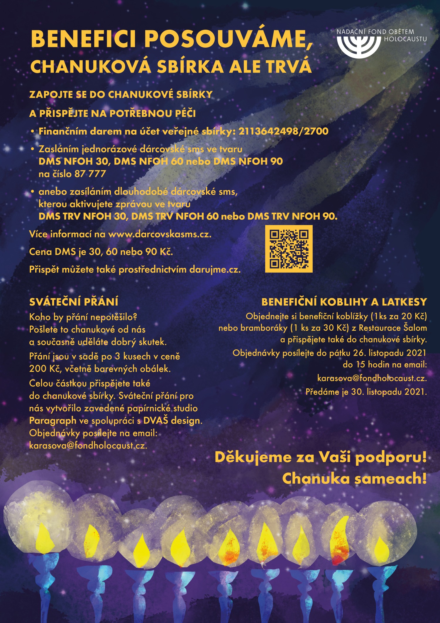 Chanuková sbírka ale trvá, zapojte se a přispějte nyní na potřebnou péči: darem, dárcovskou sms nebo zakoupením chanukového přání. Více v příloze. Děkujeme!