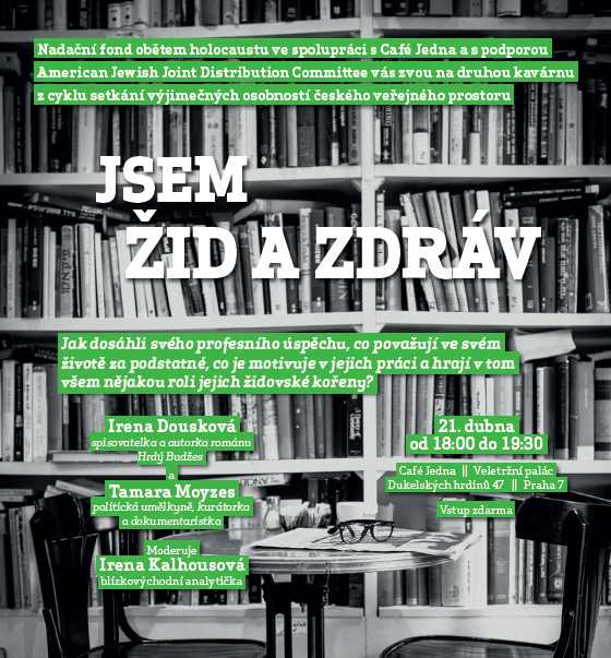 Srdečně zveme na další diskusní kavárnu z cyklu Jsem Žid a zdráv, která se uskuteční 21.4. od 18h v Café Jedna ve Veletržním paláci v Praze 7.. V panelu tentokrát zasednou spisovatelka Irena Dousková a politická umělkyně Tamara Moyzes. Program moderuje Irena Kalhousová. Vstup je zdarma. Těšíme se na vás!