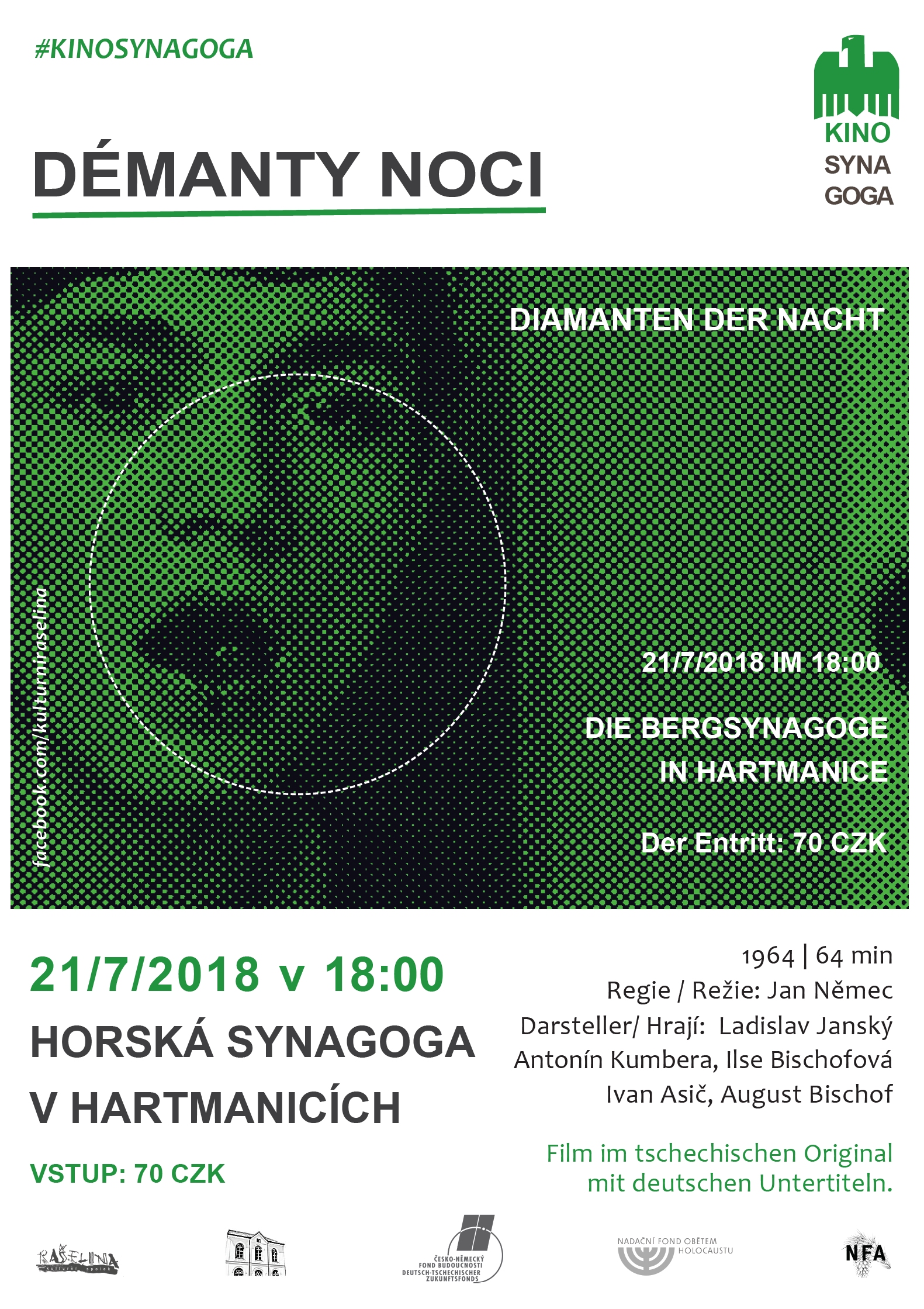 Spolek Rašelina Vás zve v rámci projektu KINO Synagoga na digitálně zrestaurovaný film Démanty noci, který měl premiéru v roce 1964. Motivem je zoufalý běh o záchranu holého života dvou chlapců z vlaku převážejícího zubožené vězně nacistického koncentračního tábora. Povídku Arnošta Lustiga natočil režisér Jan Němec, jeden z nejvýraznějších tvůrců české nové vlny. Promítání se uskuteční 21. července v 18h v prostorách Horské synagogy v Hartmanicích.