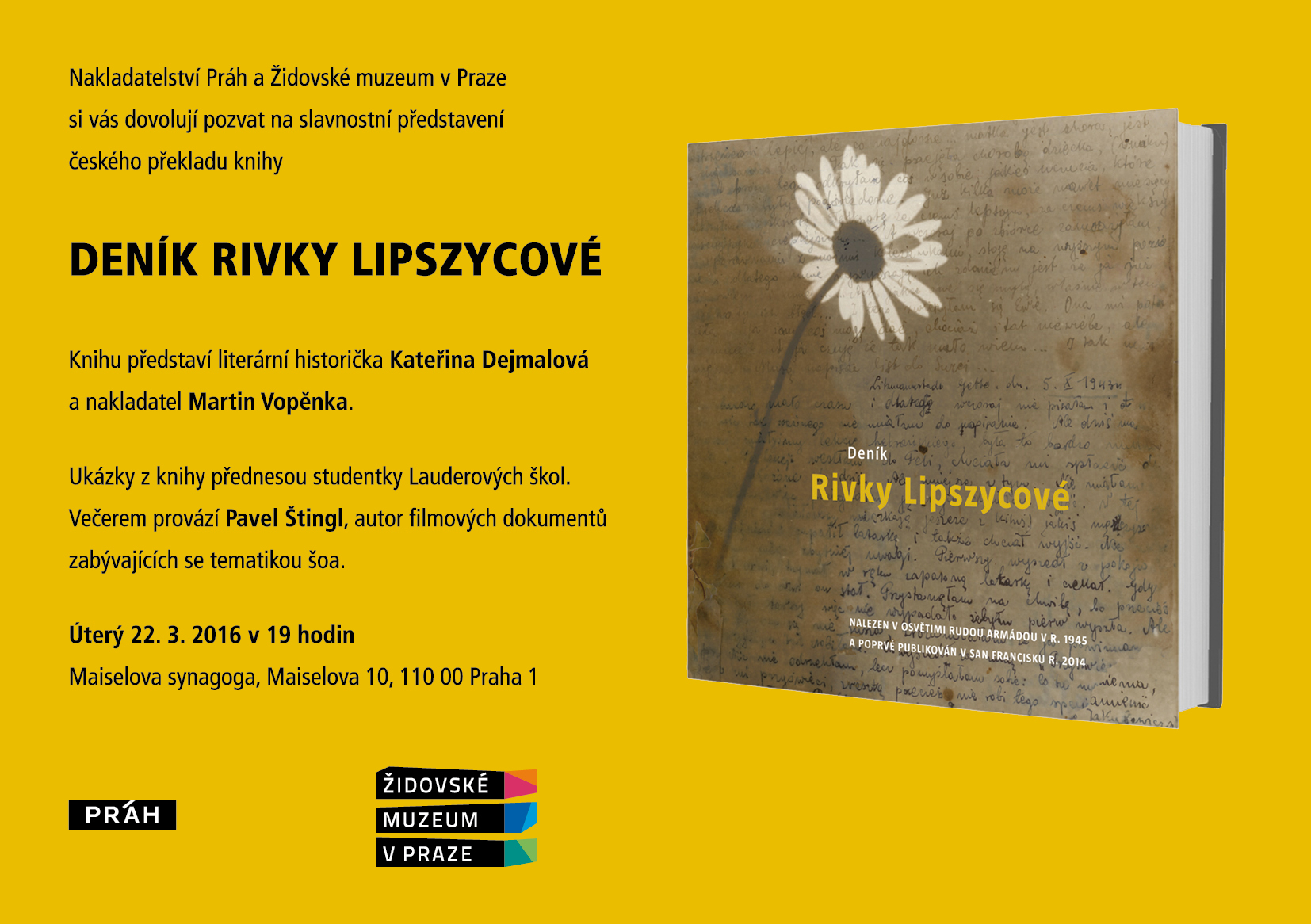 Napsal uživatel redaktor dne 9. Březen 2016 - 13:27. Zveme Vás na prezentaci knihy Deník Rivky Lipszycové, kterou vydalo nakladatelství Práh s naší podporou. Prezentace se bude konat v úterý 22. 3. 2016 v 19 hodin v Maiselově synagoze. Přiložené soubory: pozvanka_denik_rivky_lipszycove.jpg