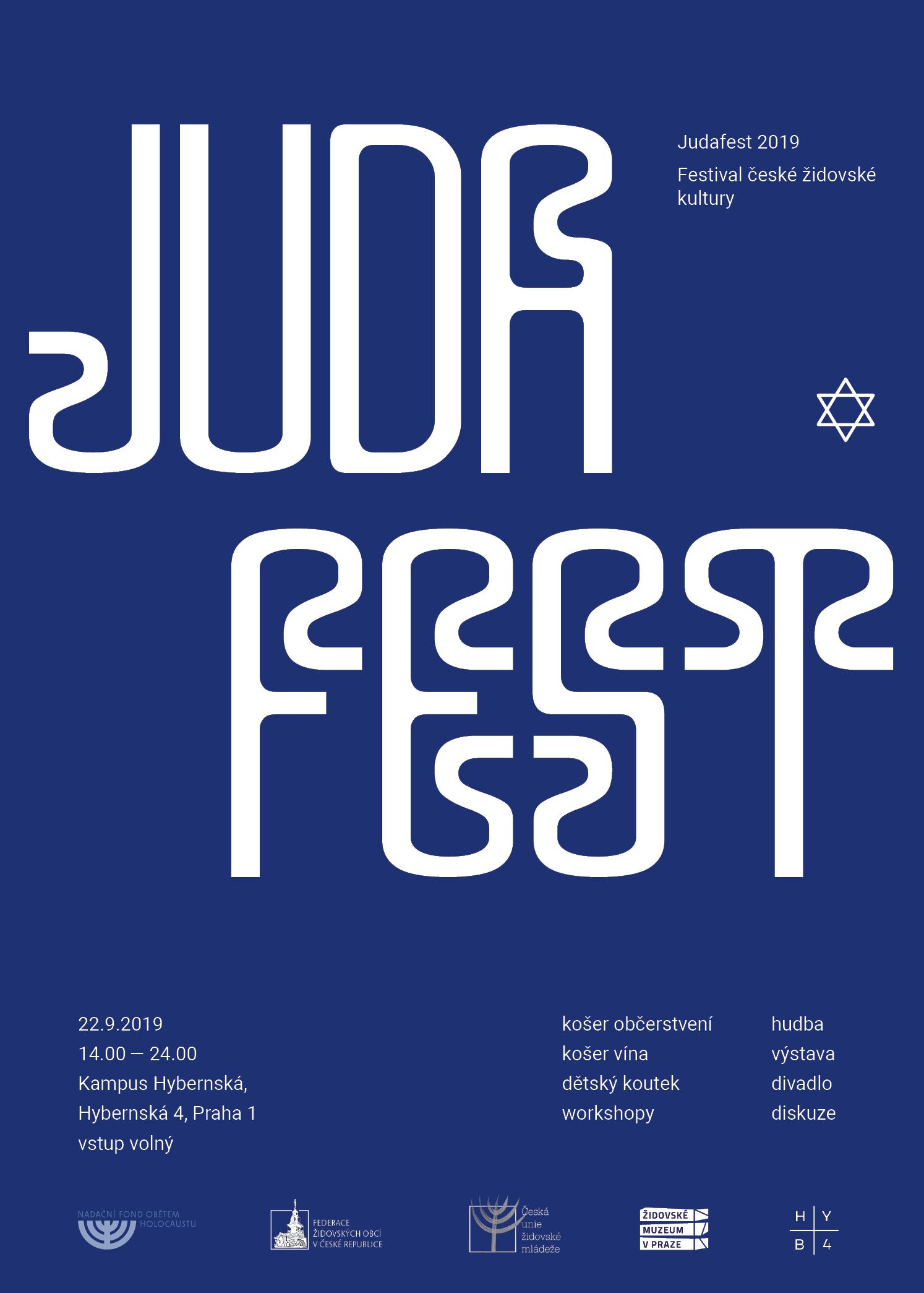Česká unie židovské mládeže Vás zve 22. září 2019 na tradiční Judafest - festival české židovské kultury. Osmý ročník festivalu představí židovské organizace, jídlo, hudbu i divadlo nebo filmy. Letos nově v Kampusu Hybernská v Praze.