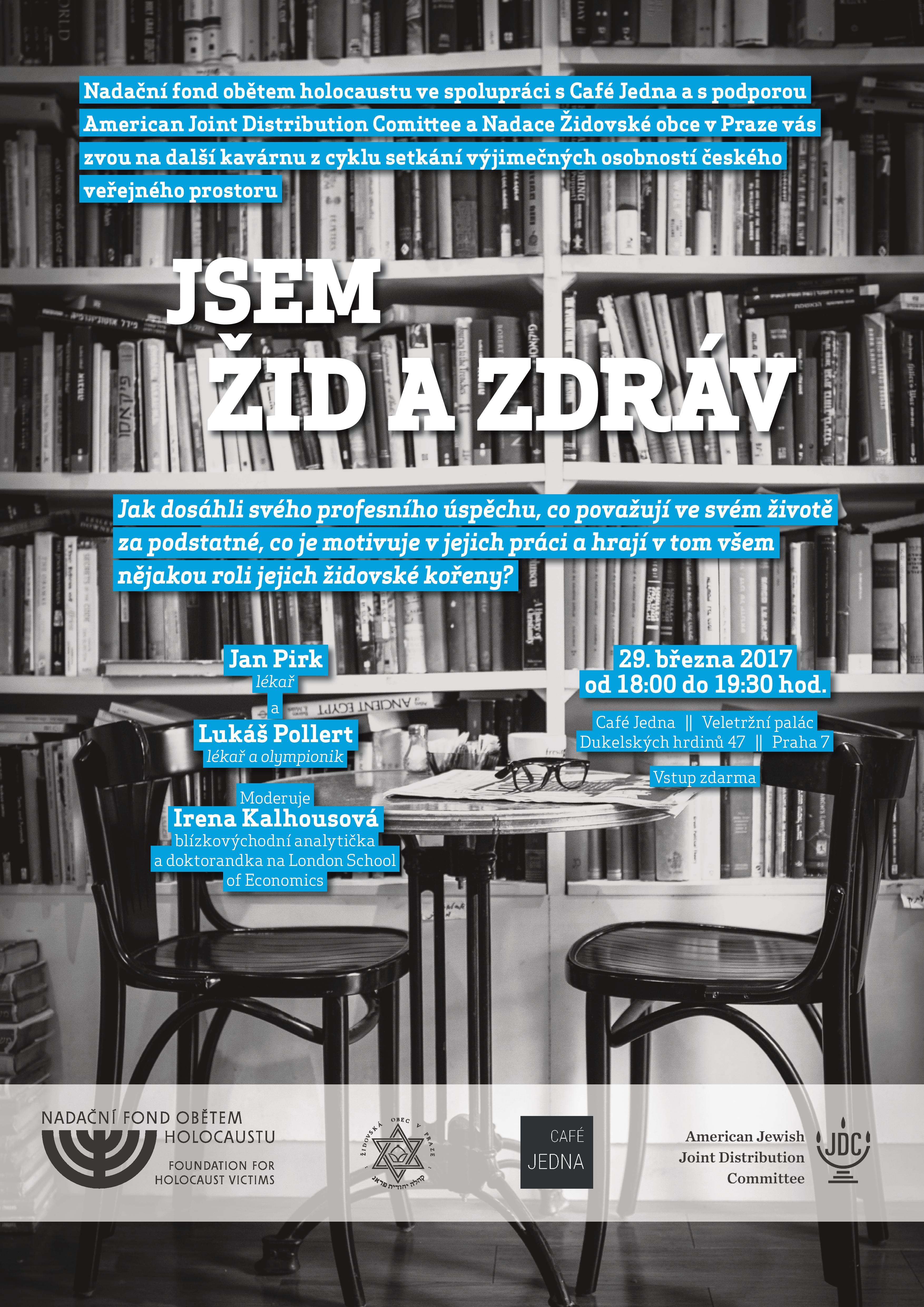 Srdečně zveme na další ze seriálu kaváren Jsem Žid a zdráv, tentokrát s kardiochirurgem Janem Pirkem a anesteziologem a olympionikem Lukášem Pollertem. Kavárna se bude konat 29. března od 18:00 v Café Jedna. Moderuje jako vždy Irena Kalhousová. Těšíme se na vás! Více informací naleznete v přiloženém plakátu,