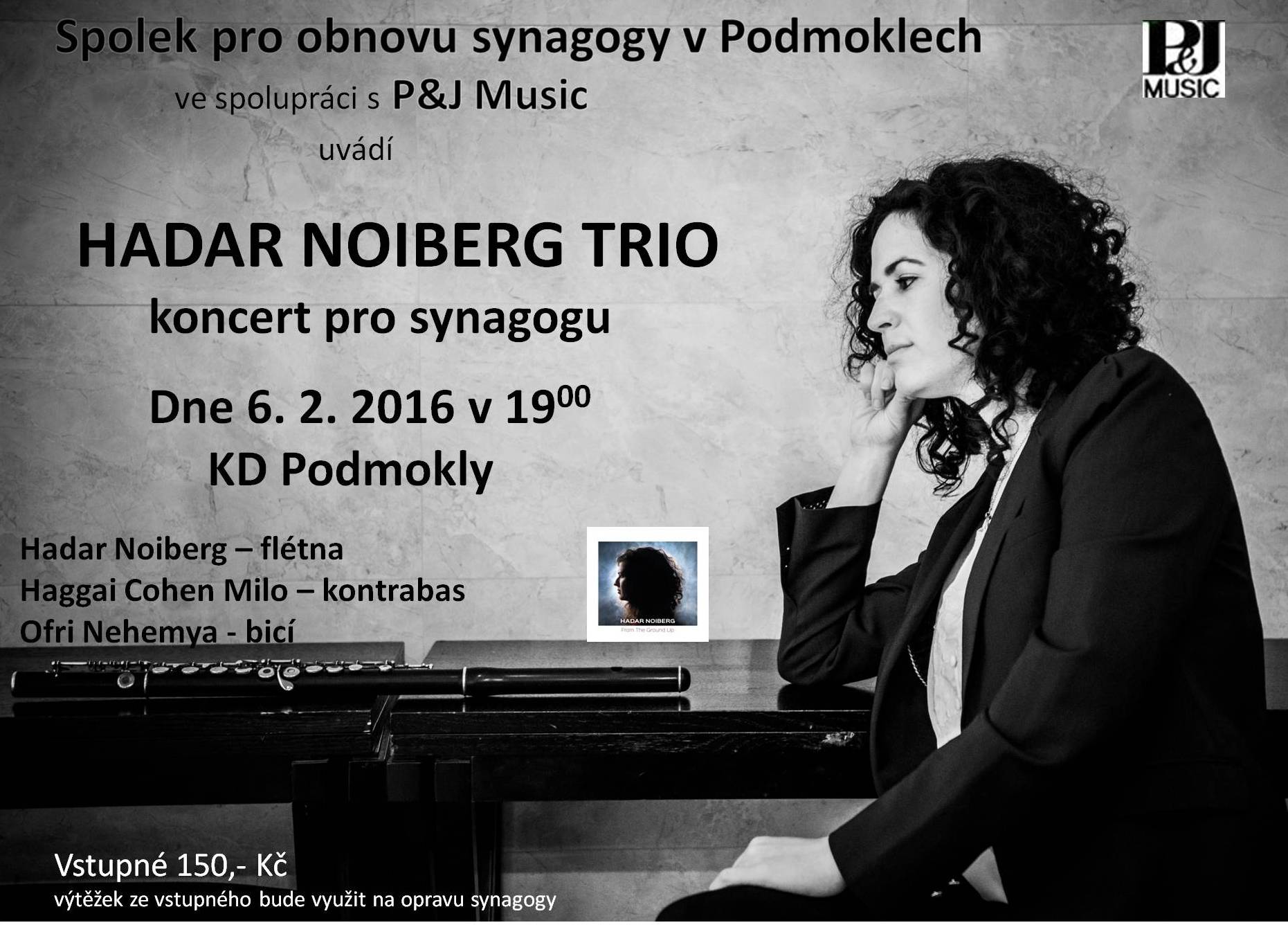 Spolek pro obnovu synagogy si Vás dovoluje pozvat na koncert izraelské jazzové kapely Hadar Noiberg Trio. Tento koncert, pořádaný Spolkem pro obnovu synagogy v Podmoklech ve spolupráci s pražskou agenturou P&J Music, je unikátní příležitostí poslechnout si tvorbu jazzového uskupení, slavícího úspěchy na mezinárodní scéně, jehož styl se pohybuje na pomezí jazzu a world music a dovedně kombinuje západní melodiku s rytmy Blízkého východu a severní Afriky. Více informací o tvorbě a hudební ukázky je možno najít na webových stránkách www.hadarnoiberg.com.