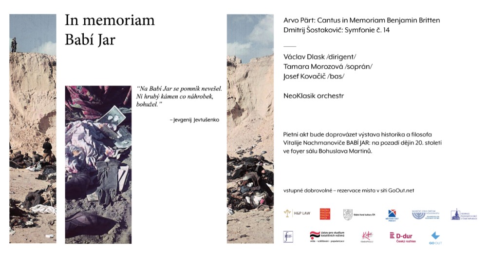 Dovolujeme si Vás pozvat na pietní akt In memoriam Babí Jar, který dne 30. září od 19.30 hod pořádá NeoKlasic orchestr. In memoriam Babí Jar připomene ve formě důstojného vzpomínkového koncertu události související s masovým vyvražďováním Židů v rokli Babí Jar (29. – 30. 9. 1941). Pietní akt doprovodí výstava historika Vitalije Nachmanoviče Babí Jar: na pozadí dějin 20. století. Jsme společně s Federací židovských obcí v ČR partnerem projektu. Více informací v příloze. Vstupné je dobrovolné, rezervace míst zde: https://goout.net/cs/listky/in-memoriam-babi-jar/qexj/