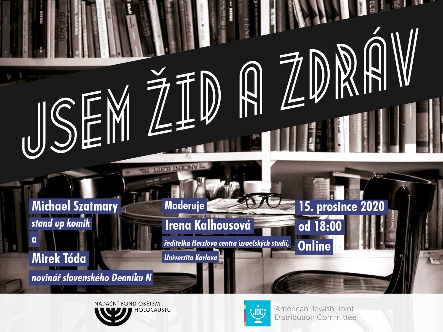 V úterý 15. prosince 2020 jsme pro vás připravili tentokrát online kavárnu Jsem Žid a zdráv. Kavárnou provázela Irena Kalhousová a našimi hosty byli stand-up komik Michael Szatmary a novinář Denníku N Mirek Tóda. Pokud jste kavárnu nestihli můžete se na ní podívat na https://www.facebook.com/116831605009596/videos/383904216030505.