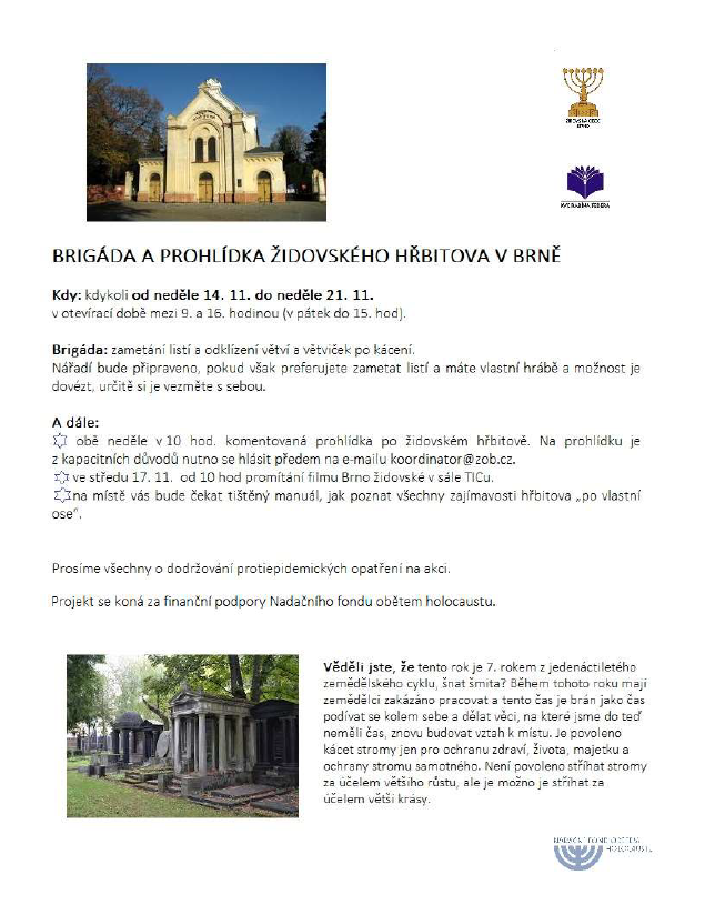 Napsal uživatel redaktor dne 25. Říjen 2021 - 14:10. Předáváme vám pozvání na brigádu brněnského židovského hřbitova, která se uskuteční od 14. do 21. listopadu 2021. Přijďte pomoci, děkujeme! Přiložené soubory: brigada_na_hrbitove_2021.pdf