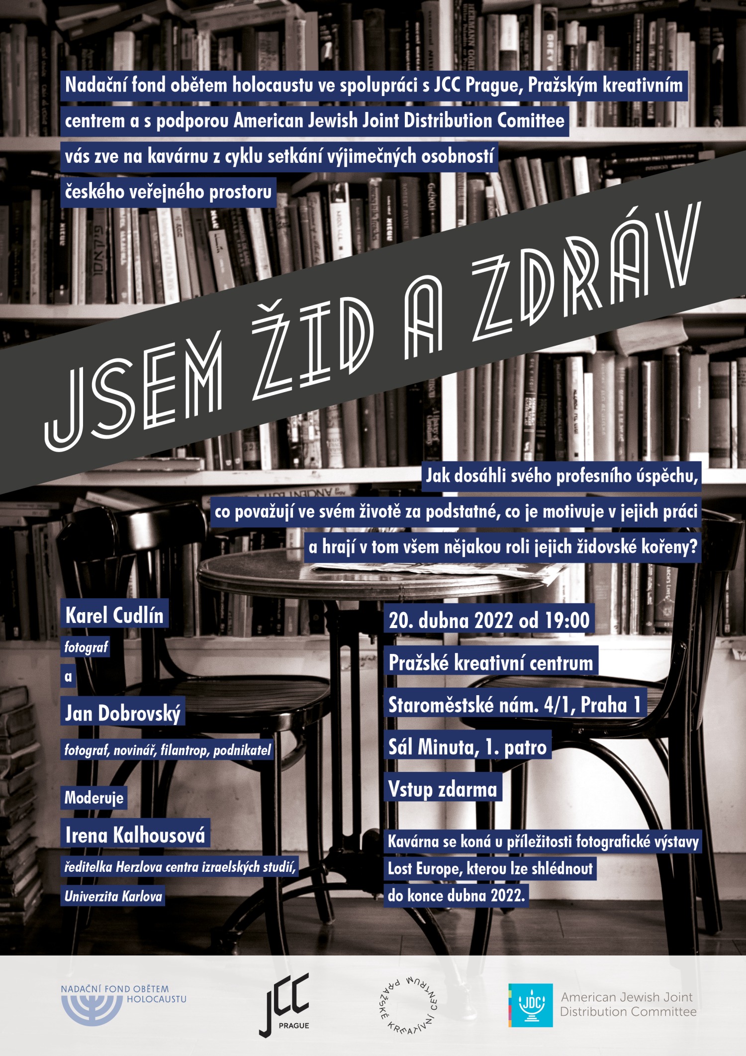 Srdečně vás zveme dne 20. dubna 2022 od 19 hodin na kavárnu Jsem Žid a zdráv, kterou pořádáme u příležitosti výstavy Lost Europe v Pražské kreativní centrum ve spolupráci s JCC Prague. Naše pozvání přijali Karel Cudlín a Jan Dobrovský, moderuje jako vždy Irena Kalhousová. Těšíme se na vás!