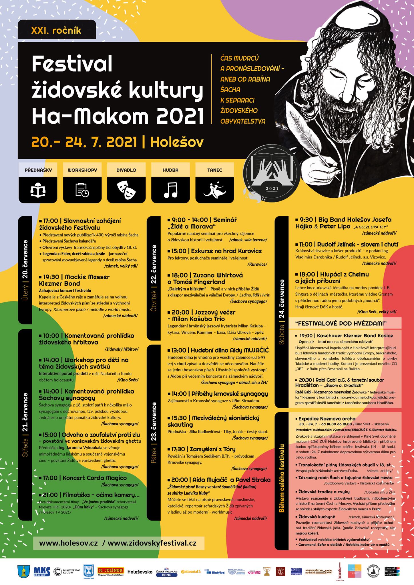 Město Holešov Vás zve od 20. - 24. 7. 2021 na již XXI. ročník festivalu židovské kultury Ha-Makom. Program a další informace najdete na http://www.zidovskyfestival.cz/#uvod.