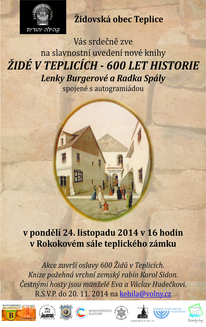 Napsal uživatel redaktor dne 3. Listopad 2014 - 16:34. Židovská obec Teplice vás zve na slavnostní prezentaci knihy Lenky Burgerové a Radka Spály "Židé v Teplicích - 600 let historie". Přiložené soubory: pozvanka_kniha_zide_v_teplicich.jpg English
