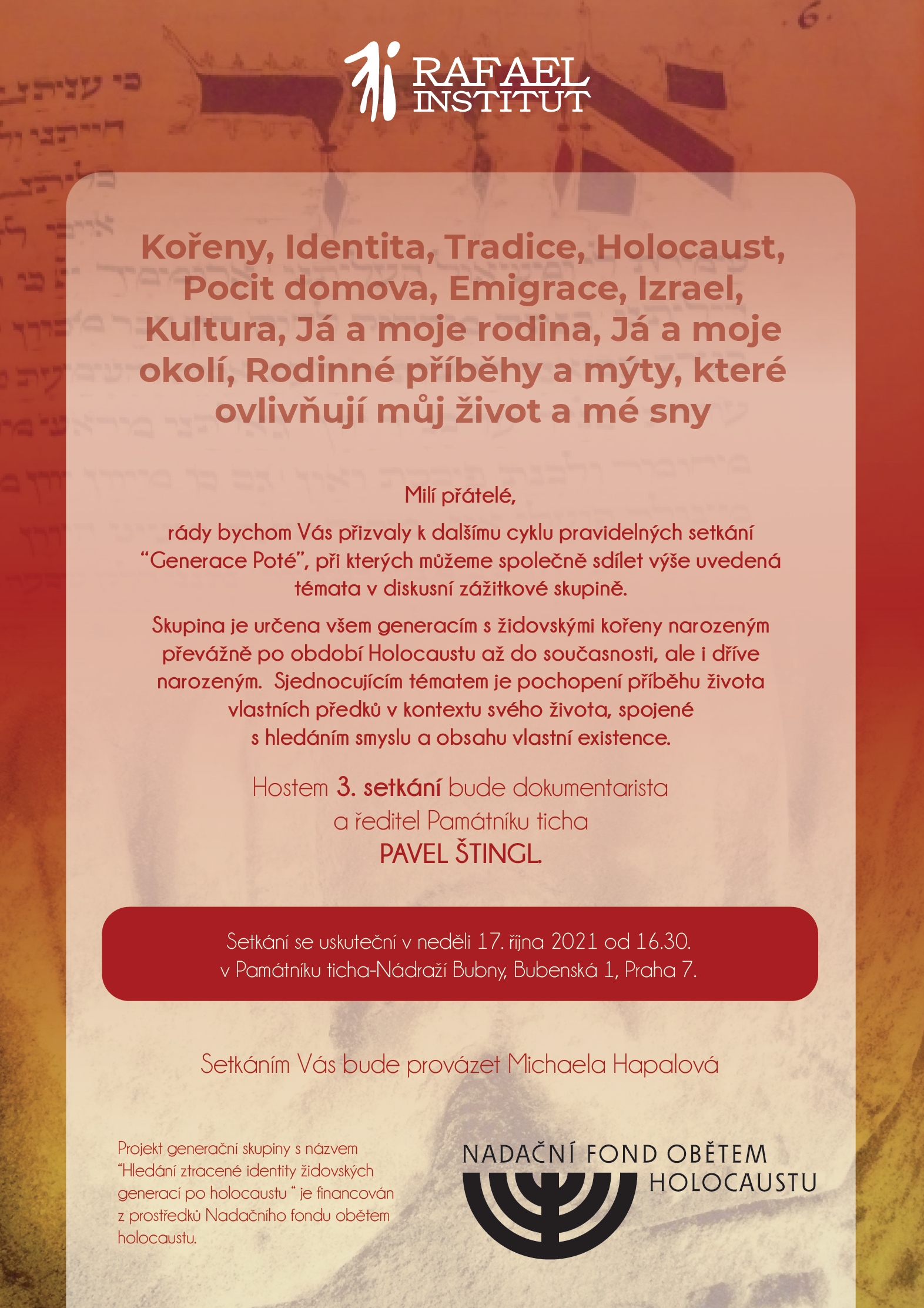 Rafael Institut Vás zve na volné pokračování tematické a zážitkové skupiny „Generace Poté“. Hosté diskusní zážitkové skupiny jsou osobnosti z uměleckého světa s rodovou zkušeností holokaustu. Role umění ve zvládání náročných a krizových událostí v životě je zásadní a léčivá.