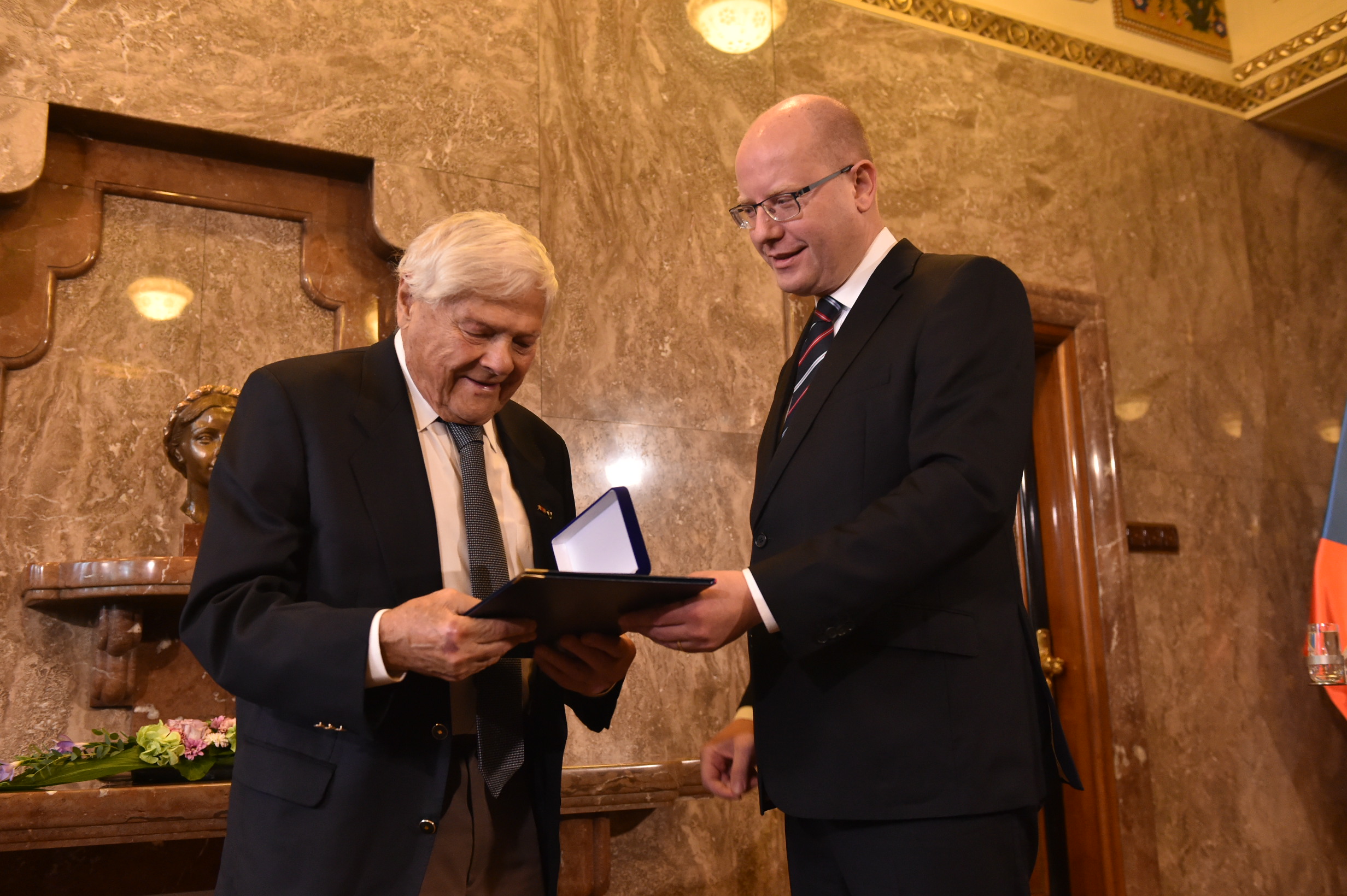 Předseda vlády Bohuslav Sobotka dnes udělil Jiřímu Bradymu pamětní medaili Karla Kramáře. Projev pana premiéra naleznete v příloze. K přítomným promluvili také pan Brady, tajemník Federace židovských obcí v ČR Tomáš Kraus a předseda pražské židovské obce Jan Munk. (foto Úřad vlády ČR)