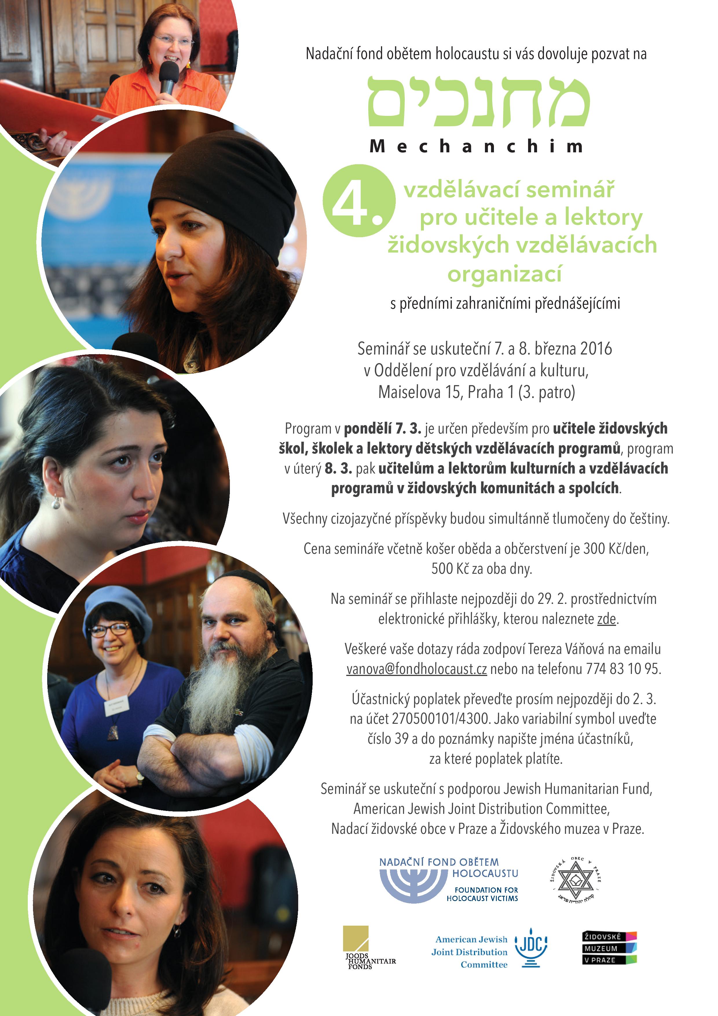 Srdečně zveme na 4. ročník semináře Mechanchim pro učitele a lektory českých židovských vzdělávacích organizací, který se koná 7. a 8. 3. 2016 v OVK Židovského muzea v Praze v Maiselově 15, Praha 1. Veškeré informace naleznete v přiložené pozvánce. Elekronickou přihlášku můžete vyplnit zde.