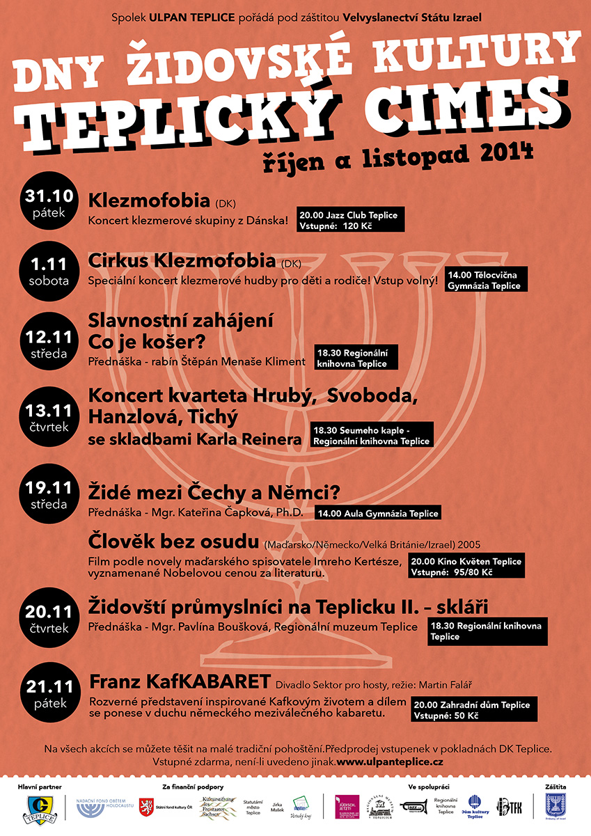 Napsal uživatel redaktor dne 29. Září 2014 - 15:24. Ulpan Teplice si Vás dovoluje opět pozvat na DNY ŽIDOVSKÉ KULTURY. Program naleznete v příloze. Přiložené soubory: program_tc_2014.jpg