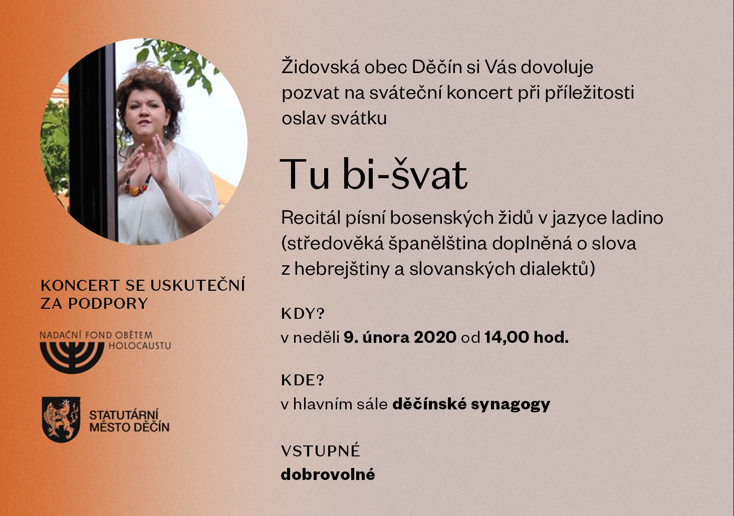 Židovská obec Děčín si Vás dovoluje srdečně pozvat na oslavu Svátku stromů, Tu Bi-švat, která proběhne v neděli 9. února 2020 v Synagoze Děčín od 13,00 hod. Na programu bude zahájení 2 výstav a koncert bosenské rodačky.