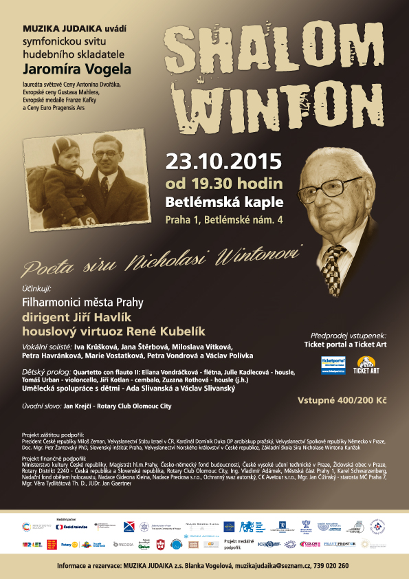 Muzika Judaika zve 23.10. 2015 v 19.30 do Betlémské kaple v Praze, kde vzdá hold památce sira Nicholase Wintona symfonickou svitou zkomponovanou na jeho počest s názvem SHALOM WINTON. Více v přiložené pozvánce.