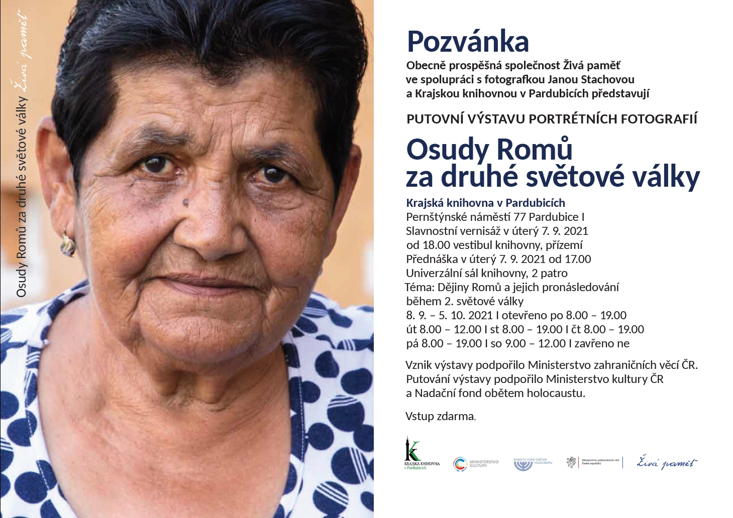 Živá pamět, o.p.s. Vás srdečně zve na výstavu portrétních fotografií Osudy Romů za druhé světové války. Prostřednictvím putovní fotografické výstavy chce zviditelnit osudy romských občanů žijících na území České republiky, kteří se stali oběťmi rasového pronásledování během 2. světové války.
