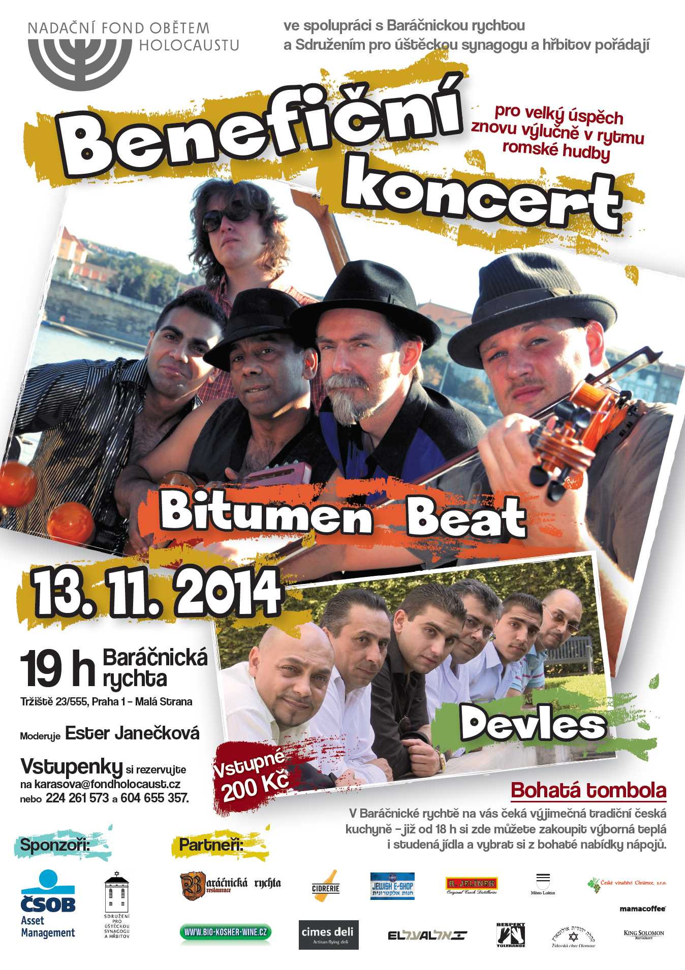We wish to invite you to this year´s beneficiary concert, which will again feature solely gypsy music by Bitumen Beat and Devles. The evening shall be hosted by Ester Janečková. The tickets are available at karasova@fondholocaust.cz or at phone number 604 655 357 Come to spend a lively evening of music and dancing and contribute to a good cause. We are looking forward to seeing you on 13th November 2014 in Baracnicka rychra in Prague 1.