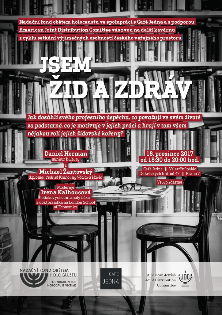 You are cordially invited to another cycle of our Café Sessions "I am Jewish and I prosper ". The session will host the Minister of Culture, Daniel Herman, and the director of Vaclav Havel library, Michael Žantovský. The moderator of this session will be Irena Kalhousová. The event will take place on December 18, 2017 from 6:30pm in Café Jedna in “Veletržní Palace” in Prague. Looking forward to your visit!