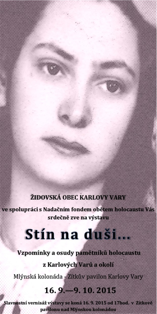 The Jewish Community in Karlovy Vary wishes to invite you to an exhibition of the memories of the local Shoa Survivors. The exhibition is called Shade over the Soul... and it is open from 16th September till 9th October 2015 in Zitek Pavilon over the Mlyn Colonade in Karlsbad.