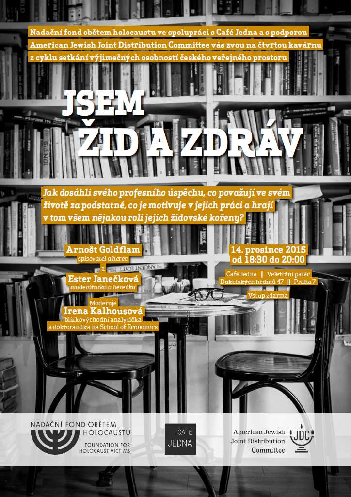 Srdečně zveme na naši čtvrtou kavárnu z cyklu Jsem Žid a zdráv, která se koná 14. 12. od 18:30 v Cafe Jedna. Hosty jsou tentokrát Arnošt Goldflam a Ester Janečková, moderuje Irena Kalhousová. Více informací naleznete v přiloženém plakátu. Těšíme se na Vás!