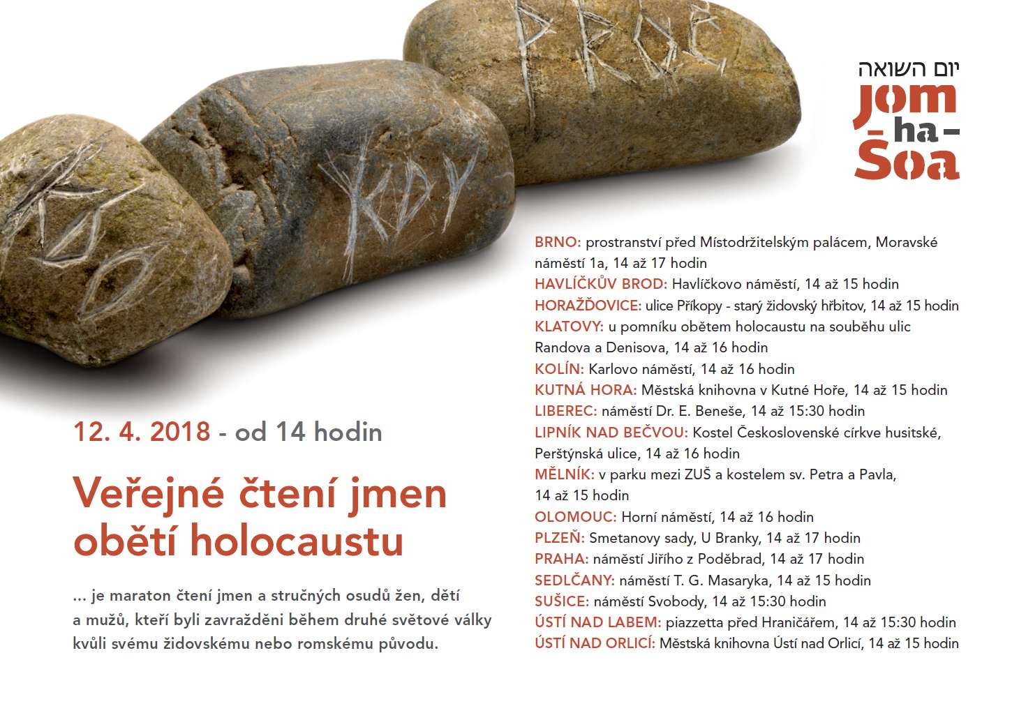 Terezín Initiative Institute would like to cordially invite you to public reading of the names of Holocaust victims. The reading will take place on Thursday, 12 April 2018, from 2:00pm, in 16 towns nationwide. Apart from traditional cities like Prague, Brno, Olomouc, Liberec, Pilsen, Ústí nad Labem or towns like Sušice, Kolín, Kutná Hora, Havlíčkův Brod and Klatovy, several other towns are joining the commemorative event this year: Horažďovice, Lipník nad Bečvou, Mělník, Sedlčany and Ústí nad Orlicí.
